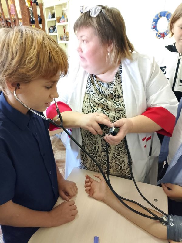 Во время практической части встречи Мария Александровна показала ученикам как накладывать повязки на руке и голове, как измерить давление. Ребята с удовольствием измеряли температуру тела, прослушивали фонендоскопом биение сердца и легких.