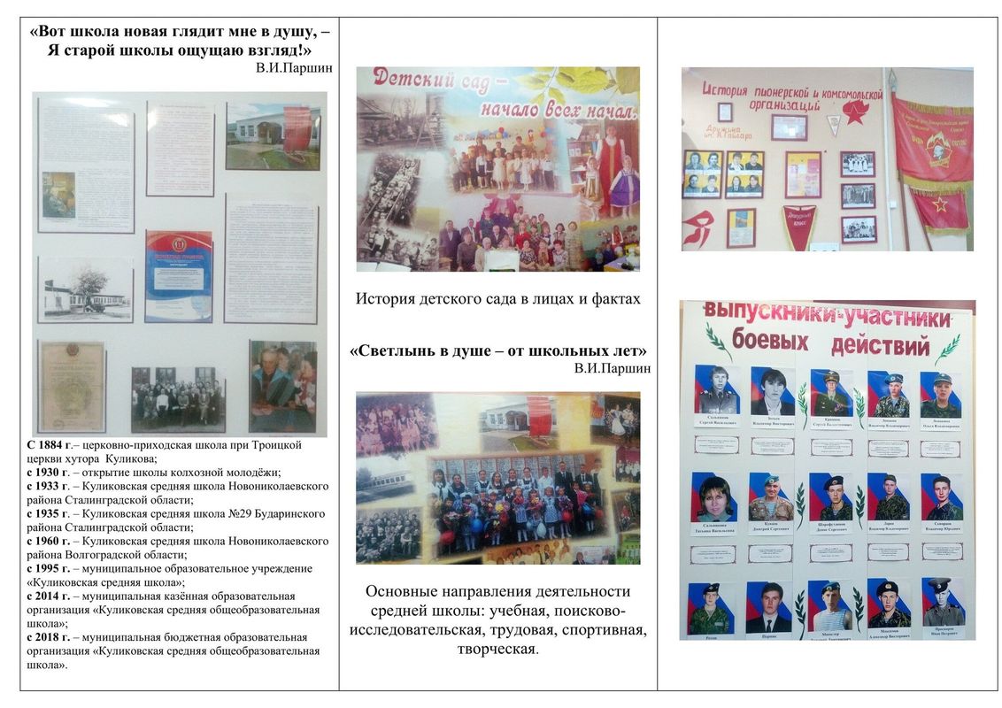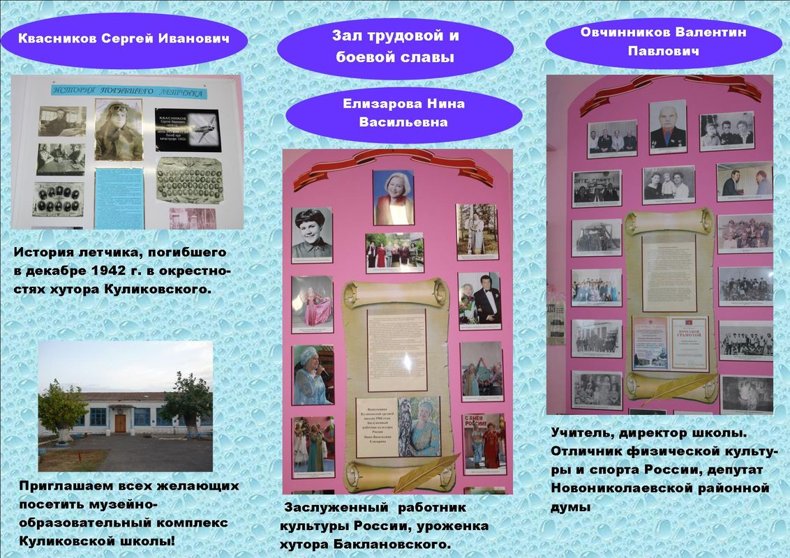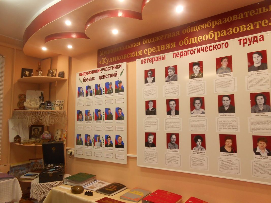 В Куликовской школе создан музейно-образовательный комплекс, состоящий из 6 залов: музея "История школы", литературного, этнокультурного, зала боевой и трудовой славы, зала Победы и музея-мастерской: