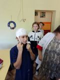Во время практической части встречи Мария Александровна показала ученикам как накладывать повязки на руке и голове, как измерить давление. Ребята с удовольствием измеряли температуру тела, прослушивали фонендоскопом биение сердца и легких.