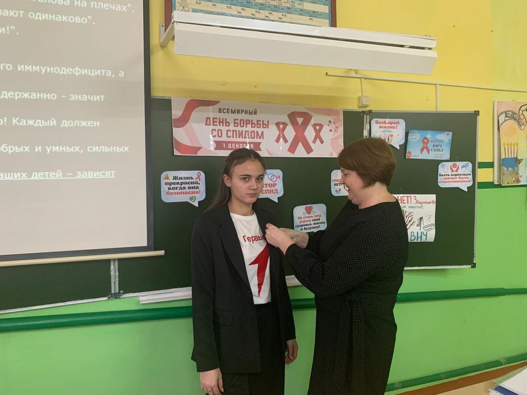 Красная ленточка – это символ борьбы со СПИДом. Прикрепляя её к одежде, мы показываете окружающим, что солидарны с ВИЧ-инфицированными людьми и чтим память тех, кто стал жертвой СПИДа. В завершении беседы, красные ленточки были подарены всем присутствующим.